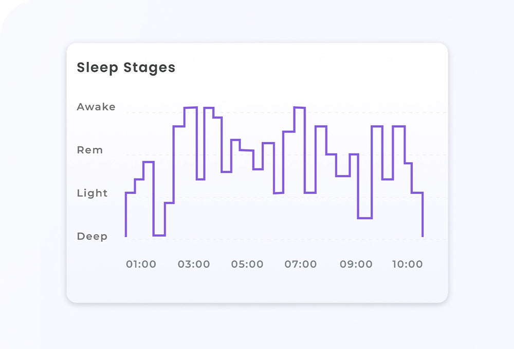 The sleep graph presents your sleep quality data in the form of sleep stages, breaking it down into Light, Deep, and REM stages along a clear timeline. This graph helps you visualize and assess your overall sleep quality by combining data from all sleep stages.
